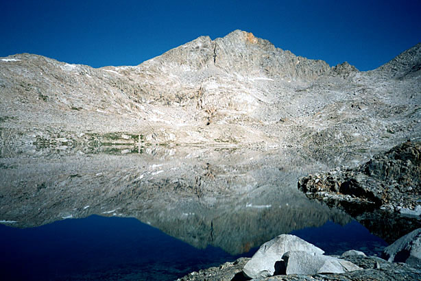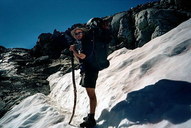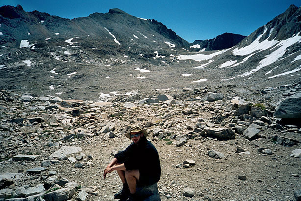 An hour, maybe more, and I'm sitting on the front stoop of the Muir Hut. Top of Muir Pass! Definitely one of the more intense ascents we've done, and probably one of the most intense on the JMT. I would wager it's even tougher than the climb from Vidette to Forester Pass. I'm alone up here, save for a pair of mangy marmots, who poke about the rocks a mere five feet from me. Oblivious to my presence, they scrounge what detritus we JMT-ers have left behind. Helen Lake below was remarkable, certainly the most still lake we've seen since we've been out here. Difficult to see at first, for its mirror-perfect reflection of the unnamed peak behind it. So of course I tossed a rock in. Fifteen minutes later the surface still blurred in places as the last of the ripples settled back into stillness. I feel pretty good, though a touch impatient. I'm anxious to get down to Evolution Valley for some reason. Kick back. Mellow. Mom's probably not thrilled with that. I keep darting ahead like an over-exuberant dog, continually pausing to check behind. Make sure she's alright and make sure she's still there. . |