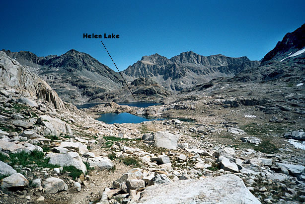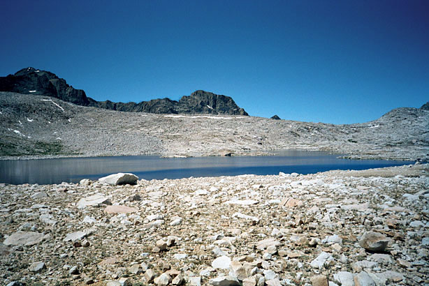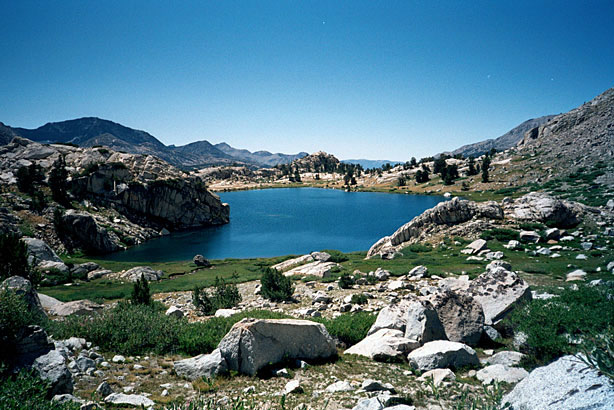 | Then I started down the hill alone, past McDermand and on to Wanda. It was a long slog past other lakes and finally to Sapphire. My toes hurt by then so the Tevas went on all the way to the end of Evolution Lake- a very hot bit of newly rerouted and re-engineered, but not, in my opinion, improved trail. We rested at Evolution Lake and ate crackers and dried fruit (we're out of lunch stuff) and on down to the Valley. | |||||