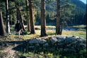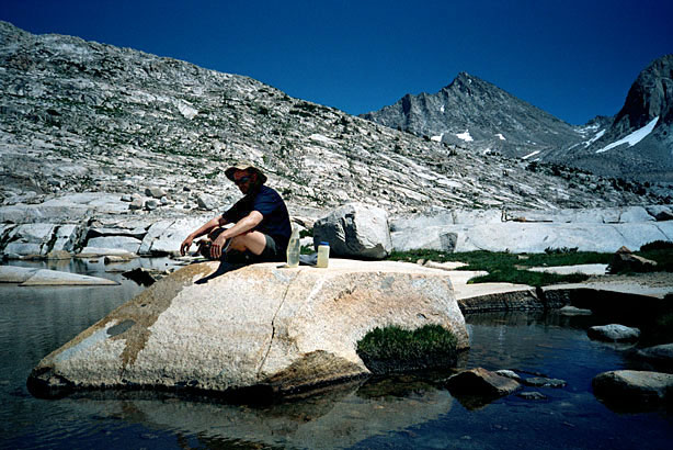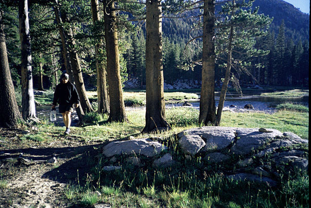 | We left about 3 and got to a nice campsite in Colby Meadow a little after 5. It was downhill from Evolution Lake to the Valley and my toes didn't hurt till the end. We splashed around in the river and Will had a fish nipping at his leg. Dinner was enchiladas and miso soup with chocolate cheesecake decadence for dessert. It is a nice site here with a meadow view right by the river. | |||||