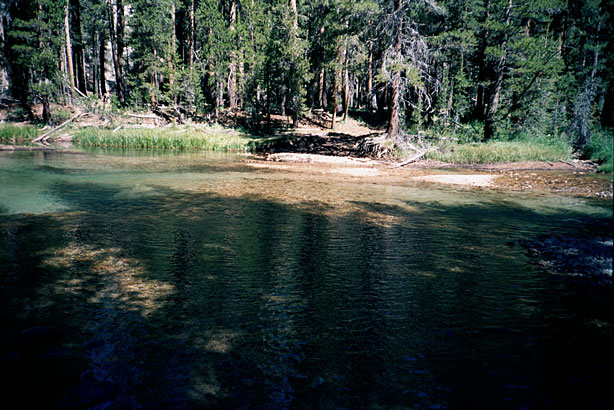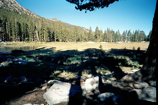 It was another long day. Will made a fire this morning and we left about 9- to McClure and Evolution Meadows and across Evolution Creek. It was wide but shallow, so on went the Tevas. The trail was rough and steep down to the Goddard Canyon and was rough and ugly to the Piute Pass Trail. I sure prefer walking on smooth dirt. |