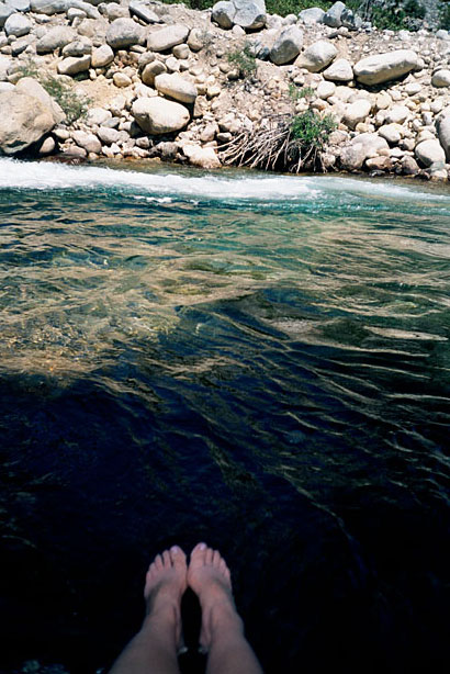 Evolution Meadow is a spectacular stroll, beautiful in its own right, but made special by its relative seclusion. It's a long hike in, no matter what direction one takes. So walking through it is like being allowed a privileged glimpse into a private wilderness. If we weren't so interested in getting our hands on a fresh supply of cheese and fruit, we might have taken more pictures. Take my word for it. Very nice terrain. The trail drops like a stone from the mouth of Evolution Valley, gathers itself at the bottom of a steep slope, then winds its rock-studded way down a warm canyon. It meets the San Joaquin at a bridge where we sat and soaked. Here's a picture of Mom's feet: |