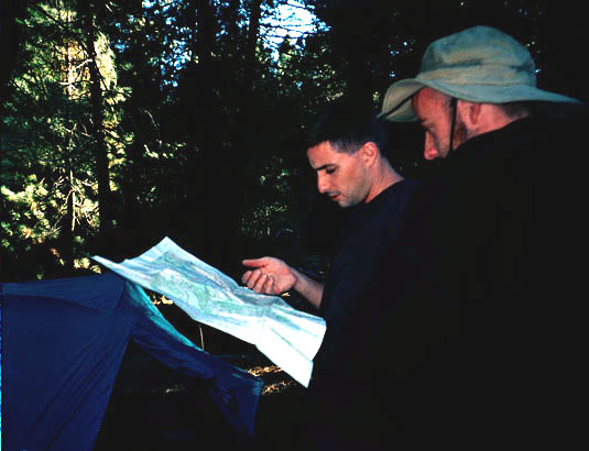| Will gave up waiting and came back to camp. He left his pack on the trail as a marker. Keir and Becca and Sean showed up after 4:30. We'd just about given up hope for that ferry. Apparently, Keir had sprung a leak in his tire and had to stop to put on another at Huntington Lake. And the road to Vermilion and Florence was long and rough and took extra time to navigate. It sure was great to see them. They set up tents and we all fixed dinner. Keir brought sausages and beans and Milanos for dinner. We again had a fire and talked and watched for meteors but saw only one. It is time for the Perseid meteor shower but there is also a full moon. | |||