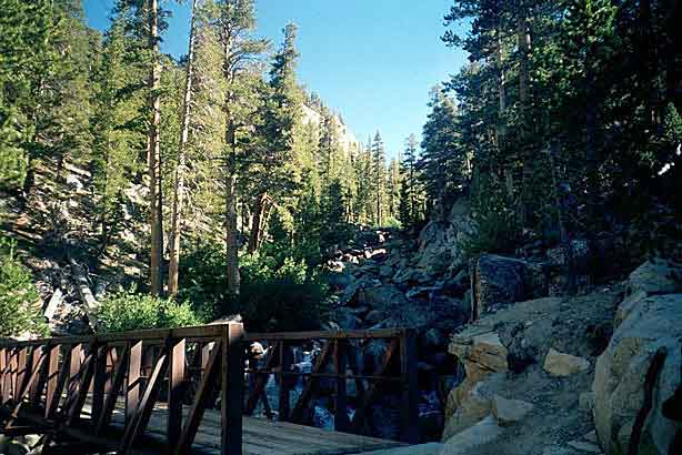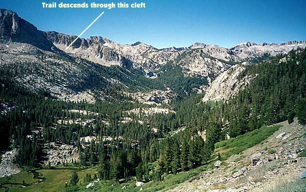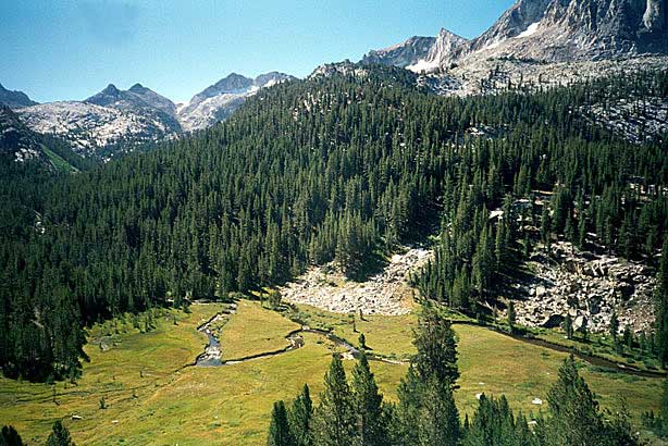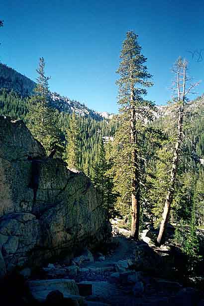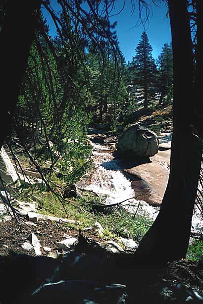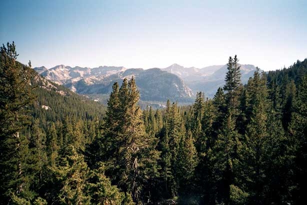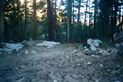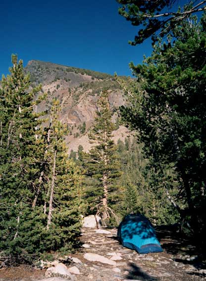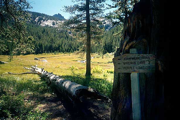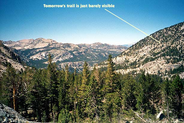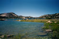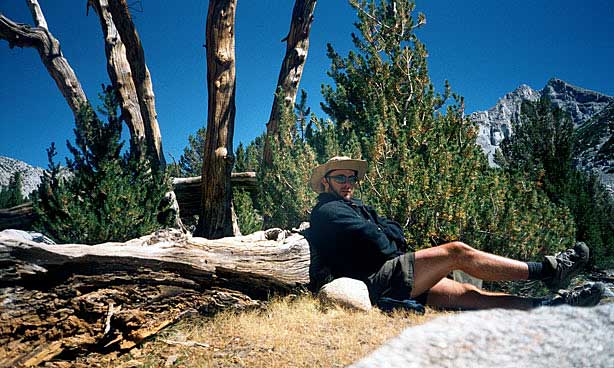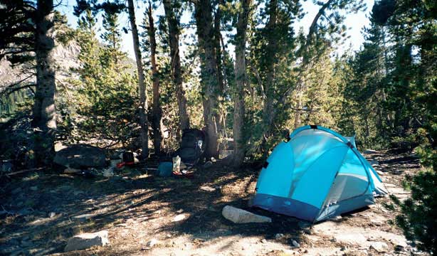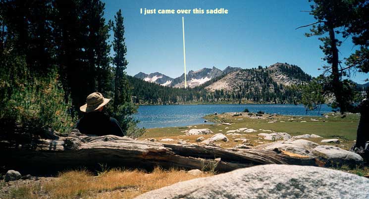 Short day today. Total mileage: six miles. But that's not counting the hour I traipsed around Purple Lake in search of a campsite. There are a few people here. More than a few. Like, a thousand and six. I ended up choosing a site high on a ridge above the lake. Dry, rocky and off the trail a ways. I rinsed off creekside, filed my two water containers to capacity and trudged up to camp. The nice thing is the 270-degree view, which encompasses a big chunk of the Silver Divide and the peaks surrounding Purple Lake. Incidentally, the lake's not purple. It's deep green. I'm guessing the name "purple" comes from "bruise," which, thanks to overuse, is an apt name for the place. I pitched the tent and crawled in for some TROPIC OF CANCER and a short nap, after which, somewhat rested but hardly invigorated, I hobbled around on pain-gutted ankles in search of the motivation to make dinner. Corn pasta tonight with dried peppers, spices and cheese. The usual. Tomorrow's a big day. Crater Meadow appears to be a good ten miles away. Fortunately, a big chunk of that seems to be downhill so I foresee getting there by naptime. The corn pasta should help. So should, I hope, the dessert, which was one of the more peculiar concoctions on which I've had the pleasure to dine this trip. I had expected cheesecake pudding, but maybe the milk I used shouldn't have been soy milk, or maybe it wasn't cold enough, or maybe I didn't stir it long enough, or I stirred it too long. Who knows? The end result was "cheesecake milk." So I drank it. |