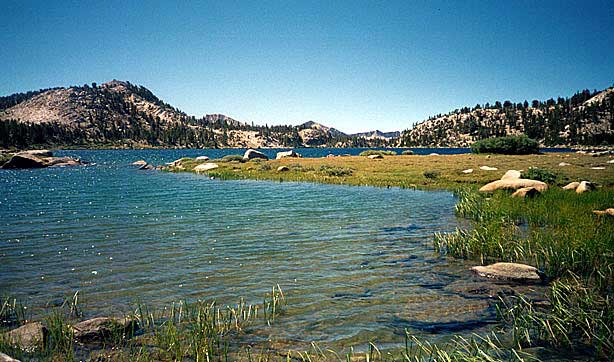 | Lunching on the shore of Lake Virginia. Nothing at all like the picture in the Winnett book, but possessing a certain austere beauty. A very open area, scoured by a persistent, surprisingly chilly wind. I've settled against a log in full sunlight, just dined on salami, crackers and hummus, some dried cherries and a rather bland corn tortilla. It's a touch lonely here. The wind starkens the effect of the openness but there's a peace here as well. The rays are warm. I'm bundled in my fleece. The lake is sparkly and alive. | ||||||||