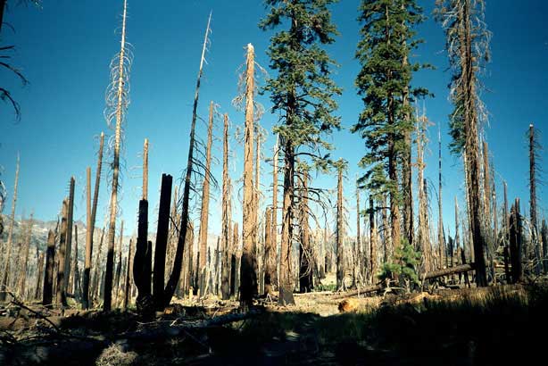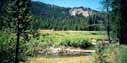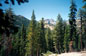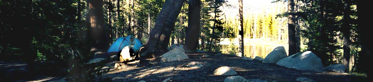 | Had to work out a sort of menu plan for the next few days, then waltz into the store at Red's Meadow to see what was available for the picking. I'm sitting at the counter at the resort greasy spoon-the name of which escapes me-wondering whether salami, peanut butter and M&M's will really o me for lunch over the next four days. There are a number of odds and ends tacked to the wall here. A nice photo of Ediza Lake with the caption, "Lake Ediza," a cartoon drawing of several woodland animals holding a fire hose over a tiny burning tree with the slogan, "We survived the rainbow Fire" Mammoth Lakes, CA 1992. I guess that August fire eight years ago was responsible for that scorched earth I just walked through. There are also photographs of Cecile Lake and Garnet Lake, two eight-point bucks who've been to see the taxidermist, not to mention a bear, who's been made to look as if she just witnessed a backpacker give one of her cubs a rather aggressive "noogie." Unfortunately, an otherwise inaccurate pose for the poor bear. Lunch is done. The waitress struggles to spell "enchiladas" on the menu board (tonight's special.) the trail beckons. I'll go outside and loaf for a bit, perhaps (like Larry Darrell) and wander by the monument. Then head up to Trinity Lakes, some four miles distant. | |||||||