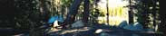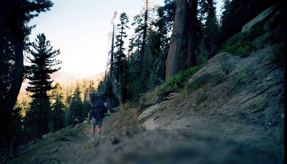 The Trinity campsite is fair. I have a view of the lake, lodgepoles and silver fir surround me. But it's not necessarily the campsite itself that will immortalize tonight. It was the surreal vision that swept THROUGH it while I was preparing dinner. Corn pasta again, this time with half a package of curry and coconut milk. [Special note: one cup of corn pasta (dry) is TOO MUCH FOOD. I could barely fit it all in. I even took a picture of myself with an empty pot and an about-to-barf expression on my face.] I was measuring powdered coconut milk into a cup measure in order to determine how much was half, thereby learning how much I could pour into the Ziploc Bag I had liberated by removing the one garlic clove it contained (I'm going into tremendous detail here to show how mundane was the task that was about to be interrupted) The coconut milk was lumpy. It came out of the bag all wrong. Some spilled on the rock I was using as a kitchen space, and I thought to myself that I was glad it'd occurred to me to cook far away from the tent on this particular evening. The last thing I'd want to have sniffing 'round my tent in the dead of night was-- A thump came from somewhere in the trees. My first thought was that a pine cone had fallen. Or a stone. No wait, I knew that noise. It was a hoof. Horses were coming. Big deal. But there have been times when what I thought was a horse turned out to be a deer, so I stood up to look. Some kind of activity through the trees. I couldn't make it out. A flash of brown hide. Tan, actually. It was a deer. And then I saw something else. A dog! I immediately understood what was going on. Or thought I did. Someone's dog had gotten excited and was chasing a deer through the brush and trees. A flash of indignation sparked through me and then died. It wasn't a dog. It was a coyote. The two of them disappeared out of sight behind the fat rock I was leaning against. As carefully as I could, so as not to spill even more coconut milk powder, I got up for a better view. The two participants were headed my way. I knew now what was going on. A coyote was chasing a deer. This was a hunt, and it was about to come barreling through my little, overused campsite. I saw the coyote first. It was a ragged thing, though good-sized. Hair coming in irregular tufts. Black at the roots, then mottled elsewhere. It was limping, I saw now, which suggested--no, not limping. It's left front paw was entirely missing! This was a three-legged coyote. How could it have this deer on the run? At that moment, on the other side of the rock, the deer showed up. Instead of being terrified, you know, rolling its eyes and frothing at the lips and stuff, it gave me a look that was closer to, "Excuse me, have you seen--? Oh there he is!" and he took off. AFTER the coyote. This deer was chasing the coyote. I couldn't believe it at first, but the deer, who was trailing the coyote by a good fifteen meters, put on an incredible burst of speed and disappeared after his quarry. The two of them vanished down the JMT in a cloud of dust. I stood there stupidly for a beat. Would they reappear? I stood there some more. Was I going to hear a coyote scream? Of course not, reasoned, and sat back down. ...Three fourths of a cup. That's how much coconut milk powder was in the pouch. Now if I could just pour 3/8ths of a cup back into the Ziploc bag. |