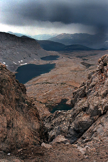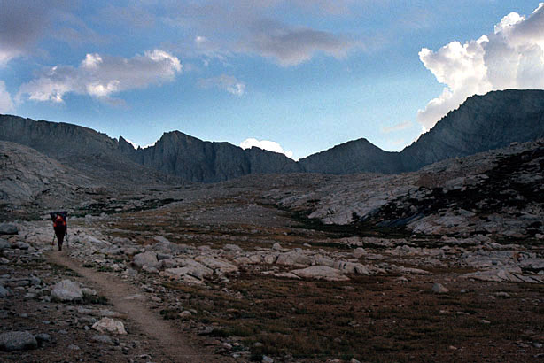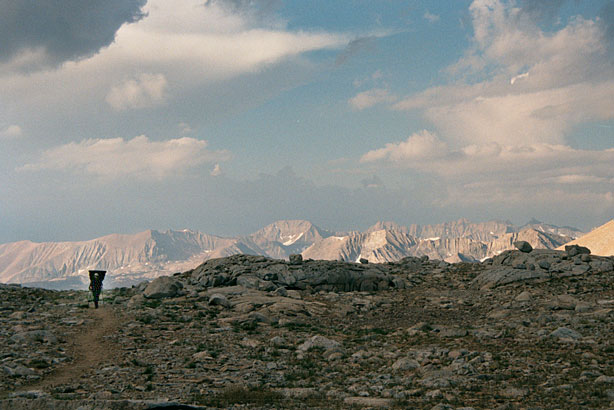 | We got an early start, partly because we figured the weather would be best in the morning, but mostly because we had the highest pass on the JMT to scale. But as we were reminded, there's just no banking on the weather out there. And though the approach to the pass was sunny and calm, we could see the peaks across the canyon to the south. They were raked by lightning and cloud. | |||||