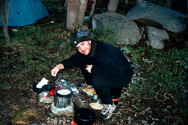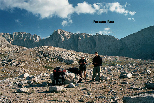 | This time twelve hours ago I had topped Forester Pass and was on my way back down to help Mom and play Sherpa for the top 2/3 of the mind-boggling ascent. It's 9:00 PM. The sky is crystal clear. A faint silvery glow traces the horizon and a fingernail moon sits on the shoulder of Vidette Peak. A perfect end to a...well, interesting day. Let's start at 3:45 AM... I awake to the distant sound of thunder. The flash of lightning. We'd gone to sleep beneath cloudy skies and, curious, I poked my head out of the tent to look. No more clouds. Stars in every corner of the sky. Except one. A great cloud hung over Whitney like a fungus. Pulling my head back inside the tent I counted the seconds between lightning flashes and the pursuing rolls of thunder. Seventeen seconds. Far away. Mom woke up at that time and we did a little vocal worrying about the weather. FLASH! I counted. Made it to thirteen one thousand. Closer. Then another flash. Ten one thousand. I poked my head back out of the tent. it was like something out of a movie. In just that scant ten minutes, the cloud-fungus had spread like a sheet across the sky. Lightning flashed. Six seconds later the thunder clattered across the bowl. This sucker was coming fast! We burrowed down in our sleeping bags. The wind came, and hit us hard. The tent shook. The plastic bag covering Mom's pack whipped about. And as I found out later, my own pack cover was lifted off my pack and carried a hundred yards up the slope. Lightning filled the sky. The tent lit up like a blue strobe. Thunder crashed right on top of us. And then came the rain. But then just like that, the storm was gone. It slammed through our part of the Sierra like a locomotive and sped north. Within minutes, everything was calm. The rain had stopped. The wind died. And all was well again. | |||||