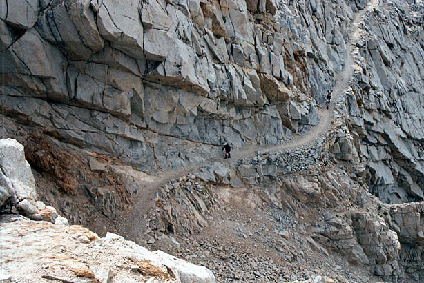 | Will went on ahead so I could see where the trail was. It went toward the right, then doubled back up high. Incredible engineering. Will came back down halfway to get my pack (my birthday present!). I continued on. It was doable but still difficult. I crested the pass at 9 am with Irene and Greg High(2 other JMTers) and George, who had come up from the Kern yesterday. | |||||