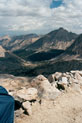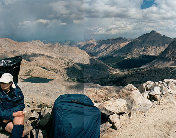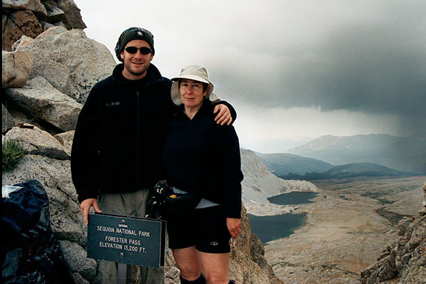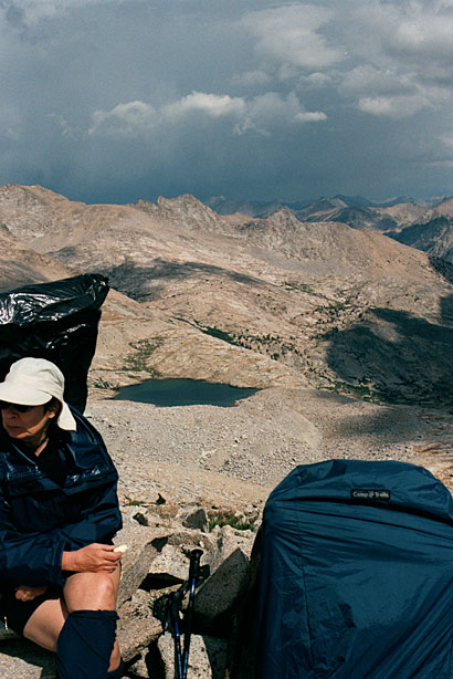 I sped on ahead of Mom, intent on playing sherpa in the interest of time. Halfway up the steep set of switchbacks (which are invisible until you're practically on top of them) I saw a second storm, this one drenching Tyndall Creek and the area where we had dinner last night. Okay, I thought, we're next. The fear intensified. I calmed myself by remembering that for all the moments of intense euphoria and joy one encounters out here, there will always be those of terror and outright panic. But we were spared. My fervent prayers to the weather gods were answered, and by 9:30, Mom and I stood on the top of the pass in fitful sunshine. We shared with three others: Irene and Greg (two fellow JMTers we met yesterday on the shoulder of Mt. Young) and another hiker named George. |
