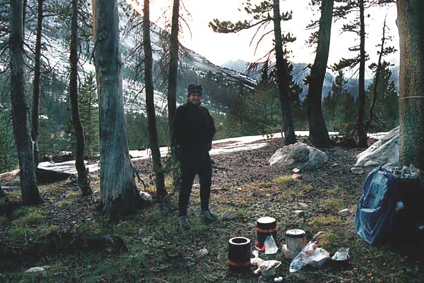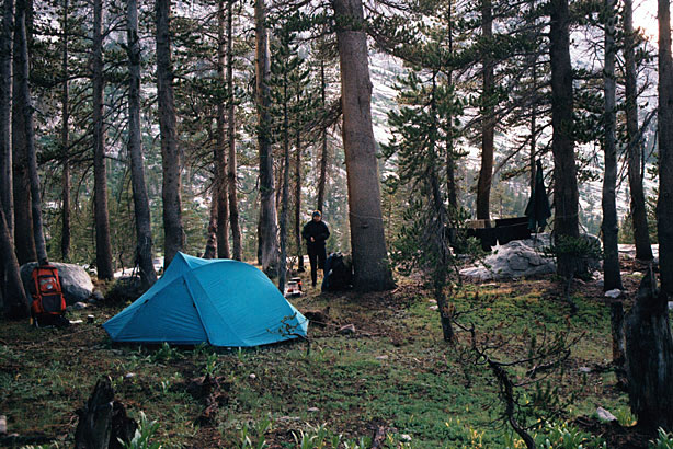 The descent to the Bubbs Creek Basin was long and arduous. Rain and shine were intermittent, requiring frequent stops for me to either put on or take off my rain parka, each time with increased exasperation. We finally made camp in a little used but pleasant and secluded spot. Below us was the descent to Vidette Meadow. Above was the crown of Junction Peak. We pitched the tent just in time to wait out an intense rain and hail storm. The weather gods had finally made up their minds and worked us for a while. |