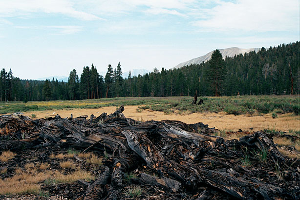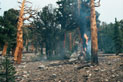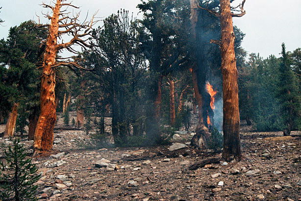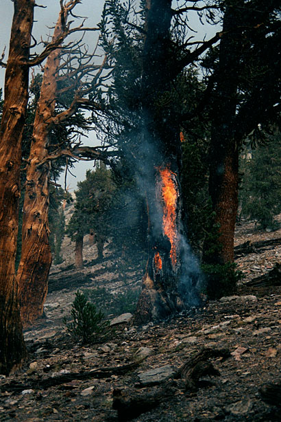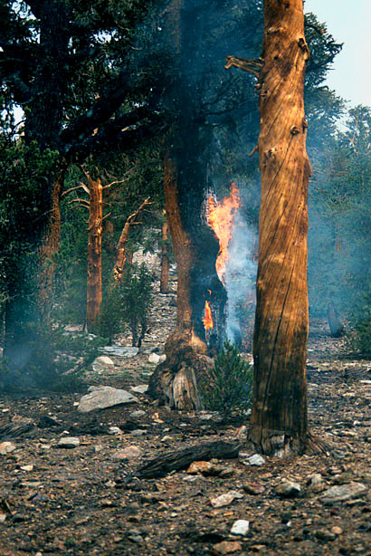 Our next stop was by the burning tree. There aren't many things that will make me take off my pack in the driving hail, dig around for a fresh roll of film to replace the one I'd finished at Sandy Meadow and with freezing fingers, snap off a couple photos. But the burning tree was one of them. A lightning bolt had apparently taken a fancy to a burly foxtail about 25 yards upslope from the trail. The thing was ablaze. It must have just happened. So I hurried upslope with the camera and clicked away. And just then, the sun came out. So I have photographs of a tree burning in a hailstorm and a patch of sunlight. Wild. |