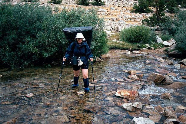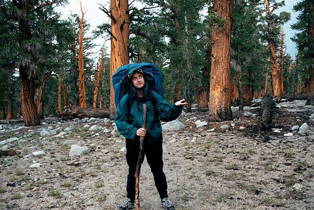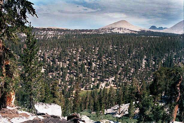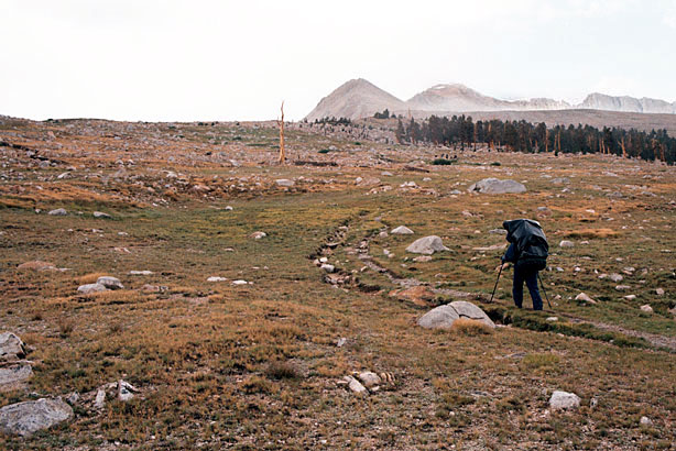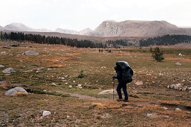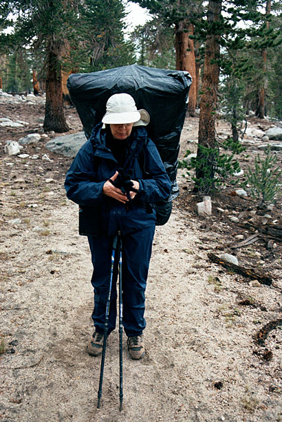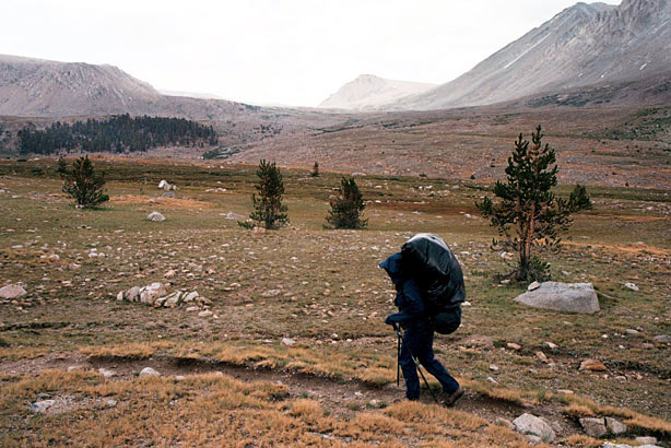 | The first teensy entry in this day's section was written at Sandy Meadow, just as the day turned an incredible shade of marvelous. We tromped down the descent to Wallace Creek. The clouds had vanished. The sky was tremendous. Mom and I had a quick bite at the creek and started up the opposite side of the canyon--a simple jag across its face to more mellow terrain above. The slog to Bighorn Plateau became difficult as a new batch of rain clouds boiled up over the eastern crest and began to drizzle. Between the weight of her pack, the need to dig raingear out of its depths and the uphill battle, Mom was soon grousing with verve. There was nothing I could do to help, so I just kept silent company as we pushed up through the nasty weather to the plateau. It was very sad the weather was so foul. The view from the plateau would have been spectacular. Wide and flat, with Tawny Point to the east, a serene, grass-embraced lake to the west and all around us, jagged peaks. But now those peaks were slate gray. Thunder rolled overhead and we were both acutely aware that we were the tallest objects for hundreds of yards in every direction. So we hurried across the plateau toward a stand of foxtail pines and the descent to Tyndall Creek beyond. The rain increased. We took shelter beneath a rather tall tree and stood there while the rain turned to hail. We were prepared to stand there even longer but a thunderclap broke directly overhead. We moved on. | |||||||