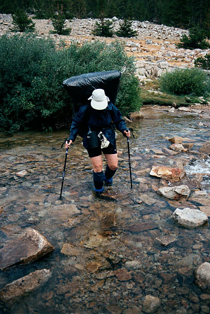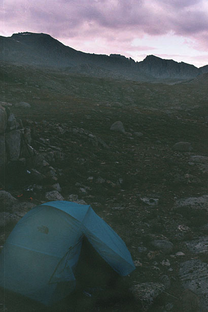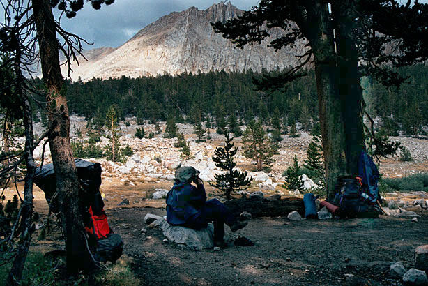 | The sun went away pretty quickly, but we were energized by its brief appearance. We made the wet descent to Tyndall Creek, forded it (it wasn't that cold) and found a campsite just on its opposite bank. We refrained from pitching the tent. Instead, we cooked dinner, rested up, dried off--the sun came out for a while--and repacked to get a little closer to Forester Pass, which is our next big challenge. In the end, we got closer than we'd imagined, thus the campsite deep in marmot territory. But I think it'll pay off, for rain is on deck for tomorrow and the sooner we get over the damned thing, the better. | |||||||
