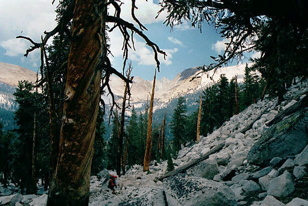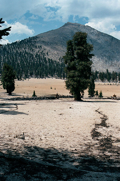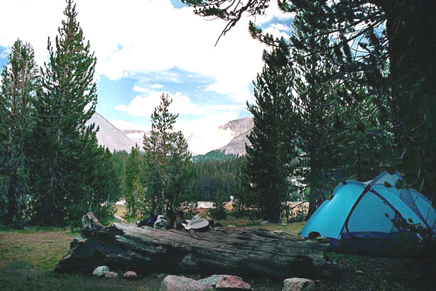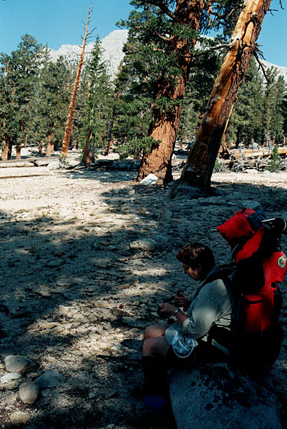 11:11- It was a tough climb to the saddle by Mt. Guyot. We started at 8:40, half hour later than yesterday. Pea soup doesn't give much energy. By 2:00 we made it to Crabtree Meadow. It was a lot farther than I thought.but we're in camp 2.5 hours earlier than yesterday. Grassy, river nearby, trail junction right across. Wallace Creek is 4.1 miles- that's about ½ of tomorrow's hike. It was a big day today. There was steep drop down to the meadows and I can't tell exactly where we are. There are huge rocky lumps and peaks surrounding us. Mt. Whitney is hidden, I think. It is over 8 miles away. There are now clouds overhead. Perhaps we'll get some rain? |