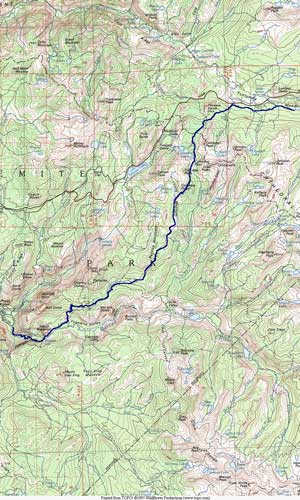 Yes, okay, we have a confession to make. We haven't done this section Northbound. Why? Take a guess. The net altitude gain is 4,636 feet. That's net. That's not counting the descent to Sunrise High Sierra Camp, the descent to Cathedral Pass and the descent to Tioga Road. The truth is, we like to end up in Yosemite Valley. If we're going to hike the distance, let's finish some place where we can stagger to a soft bed and pop open a bottle of sparkling wine. So when we did the trek from North to South (2002), we started at Tuolumne Meadows, stumbled out at Whitney Portal and then charged directly back in at Tuolumne for the descent. Suffice it to say that for people who don't cheat a little, the Southbound John Muir Trail adventure begins with a bit of an ascent. But if one were to decide on a direction based on the first few days of the trip, this end, though daunting for sure, might still be the preferred entry point. The net altitude gain is less severe than from Whitney Portal, and the highest altitude gained is but a fraction of Whitney's 14,500+ feet--a better warmup for JMT travelers.