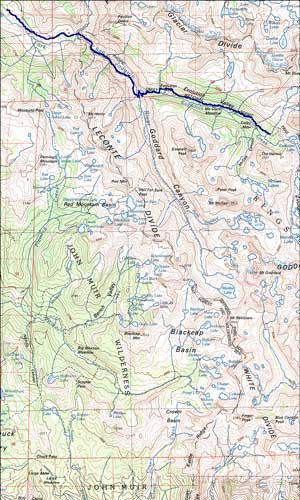 If you're headed North, you've just dropped out of the Evolution Basin and its rocky extremes. Evolution Valley is a paradise of green compared to the rock-bound lakes further South. Take your time here. Savor it. Make it last. You'll be leaving soon, and in a few days, all this will seem like delirious dream. The gradient is gentle until after you splash across Evolution Creek at the Valley's lowest end. After that the drop is quick and steep into Goddard Canyon. So yeah, it's warm, but water's never far away, and at the end of the narrow canyon lies the Piute Creek Crossing, which is like a water park, only with no lines and cleaner air. Since I only seem to hit the next segment in the heat of the day, I never seem to come away with pleasant memories of it, but the stretch leading to the bottom of the valley can be devilishly hot. But hey, at least you're going downhill. And this alone, rates this an easier direction for this segment of the John Muir Trail.