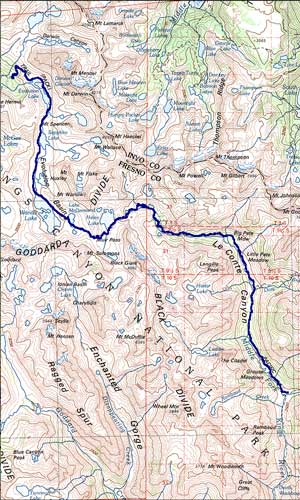 This segment is probably the most relentless climbing you'll do all summer. Once you pass the trail junction leading down into Tehipite Valley the trail climbs without pause back up to 12,000+ feet over more than ten miles. Okay, there is a pause. Grouse Meadow is a nice, flat spot. The bridge over Dusy Branch provides some level terrain, and I think there's a ten foot stretch above Helen Lake that might give you some downhill. The remoteness of Le Conte Canyon is one of the most striking things about this stretch. Watch your step, because you're a good three days from any trailhead. The North Lake - South Lake loop is a popular trip, so once you pass the Dusy Branch and it's attendant trail to Dusy Basin and Bishop Pass, the hiker population climbs a bit. You'll have some company as you toil up to Muir Pass. Lots of work, but the view from the top is worth it.